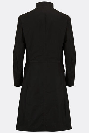 It features a short stand collar lined in corduroy, two flap front side pockets with 18th Century detailing. Two inside facing breast pockets. Two inside shotgun pockets and a double vent in the back for a swashbuckling swish in the tail.