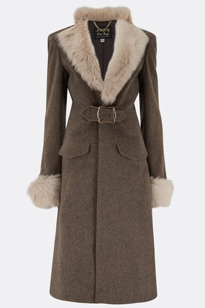 A stylish riding coat split in the front and cinched with an old English brass buckle. Made in a pure wool coating in fine repeat check with a contrast sheepskin collar and cuffs. A fitted, stylish and brazen dress coat.