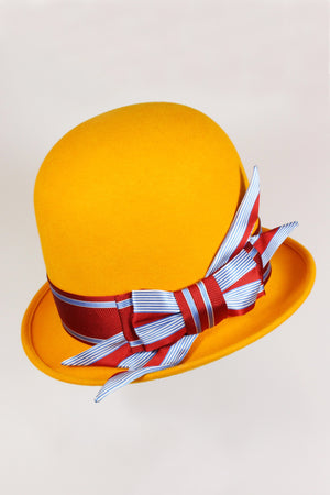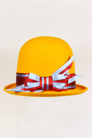 This Saffron Wild Bill has been embellished with a bespoke Ribbon and Bow handcrafted in our London studio from high quality Silk offcuts. Please