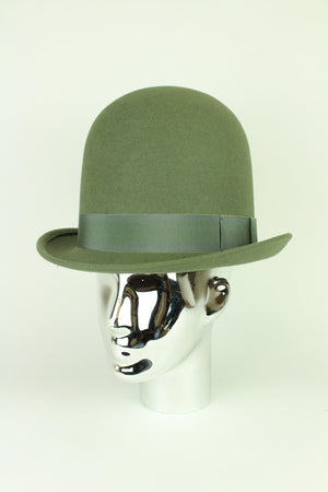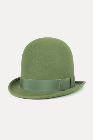 Oversized bowler hat with a large rounded crown which is further emphasised by the short brim. Finished with a petersham band.