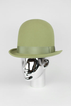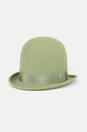 Oversized bowler hat with a large rounded crown which is further emphasised by the short brim. Finished with a petersham band.