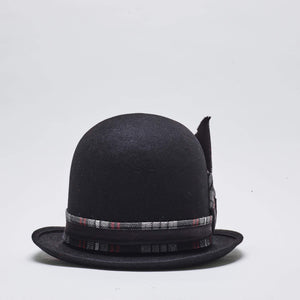 Oversized bowler hat with a large rounded crown which is further emphasised by the short brim. Finished with a petersham band.