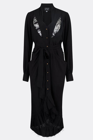 This fitted yet fluid dress features open gussets across the chest, centre back and the sleeves featuring the anatomy and bone structures of the human body printed on silk inserts. The back of the skirt is jauntily swagged, asymmetrically, giving it a generous volume. A sweetheart neckline, brass domed button front fastening with a versatile waist tie and two draped front pockets together with a raw edged gathered frill hemline make this a dress to die for.