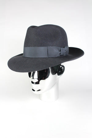 Classic fedora with a curved brim front to back. Finished with a Petersham band and a single bow.