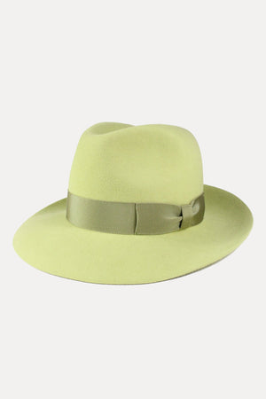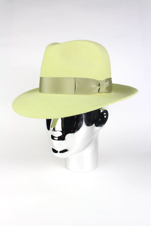 Classic fedora with a curved brim front to back. Finished with a Petersham band and a single bow.