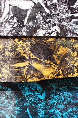 Arcadia is the mountainous district in the Peloponnese of Southern Greece. In poetic fantasy it represents a pastoral paradise and in Greek mythology it is the home of Pan and is known as being a heavenly place where anything can happen. This makes it a fitting name for our new cornucopia print design featuring Bacchanalian grape vines and 18th Century etchings depicting carnal pleasures.