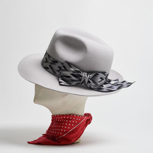 Classic fedora with a curved brim front to back. Finished with a Petersham band and a single bow.