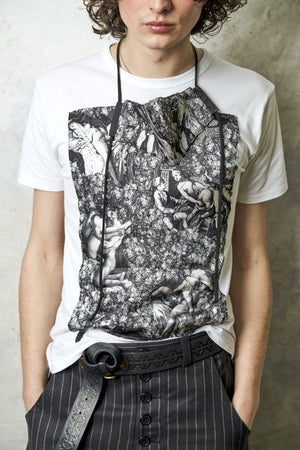 T-shirt with hand stitched silk print with 18th century pornographic etchings. All prints will differ slightly as they are cut from a larger Arcadia print cloth.