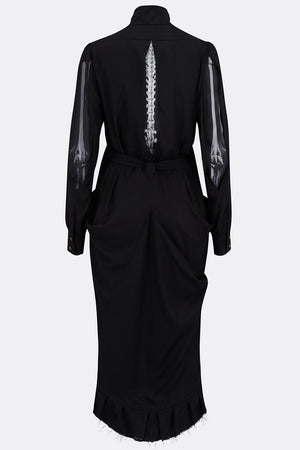 This fitted yet fluid dress features open gussets across the chest, centre back and the sleeves featuring the anatomy and bone structures of the human body printed on silk inserts. The back of the skirt is jauntily swagged, asymmetrically, giving it a generous volume. A sweetheart neckline, brass domed button front fastening with a versatile waist tie and two draped front pockets together with a raw edged gathered frill hemline make this a dress to die for.